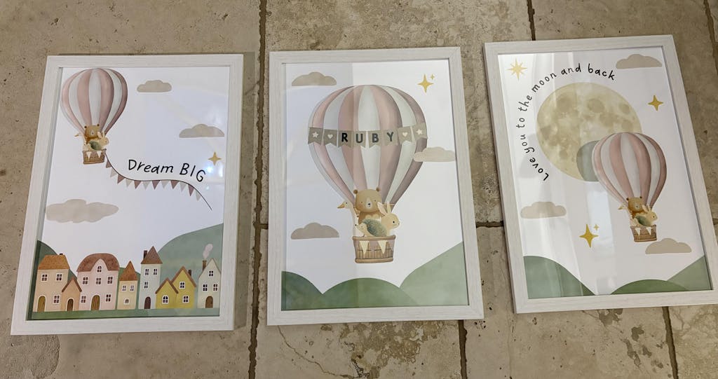 Featuring a whimsical hot air balloon carrying a bear, goose, bunny rabbit and hedgehog. This 3-piece collection brings a gentle storybook charm to any child’s room. From the pastel village below to the glowing moon above, each print is lovingly designed in soft watercolour tones for a calm, dreamy atmosphere.
